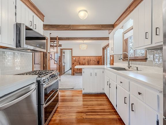 Welcome to this beautifully updated craftsman-style home, where modern upgrades meet timeless charm. This 3bed, 2bath gem features a freshly painted interior, brand-new carpeting, original hardwood floors ,and a new energy-efficient tankless heating system. Step into a bright and stylish kitchen, complete with all new SS appliances, painted white cabinets with sleek black handles, and elegant Corian countertops. A double stainless steel sink with a modern faucet adds both functionality and flair. The first-floor bath has been tastefully renovated with a new vanity and sink, chrome fixtures, classic subway tile in the tub area with a coordinating chrome showerhead, and a tile floor. Upstairs, a spacious bedroom boasts laminate flooring, sliders leading to a private balcony, an ensuite bathroom featuring dual sinks with black fixtures, matching mirrors and lighting, a tiled shower stall. Enjoy year round comfort in the 4 season sunroom with a woodstove, private deck & yard