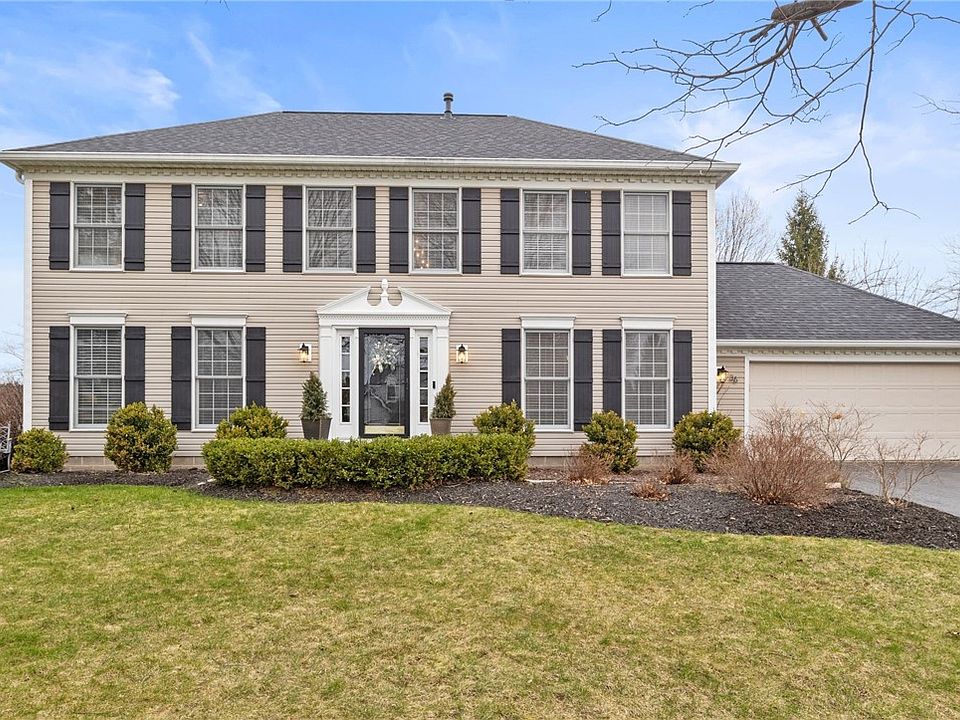 Wow! Stunning home in this sought-after neighborhood with Fairport Schools & Fairport Electric! Beautifully maintained with loads of updates throughout. Furnace/AC in 2015, tear off roof in 2022, and much more. PERFECT first floor layout. Enter through the vaulted 2-story foyer that leads to the bright and open family room and formal dining room. The kitchen has brand new quartz countertops, updated stainless steel appliances including a brand new refrigerator, beautiful hardwoods, and has the ideal open-concept layout that flows into the huge living room, perfect for entertaining. Walk through the back door to the huge deck and gazebo overlooking the almost 1/2 acre private yard. Upstairs are 4 large bedrooms, including the BRAND NEW gorgeous primary bath in 2021. Freshly painted lower level for a playroom, teen hangout, workout area, and a separate home office space. Plenty of storage space and included Samsung washer/dryer from 2020. Don't miss this DREAM home in a perfect location...nothing to do but move in! All offers will be reviewed Sunday 4/6 at 6pm.
