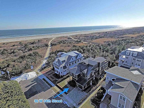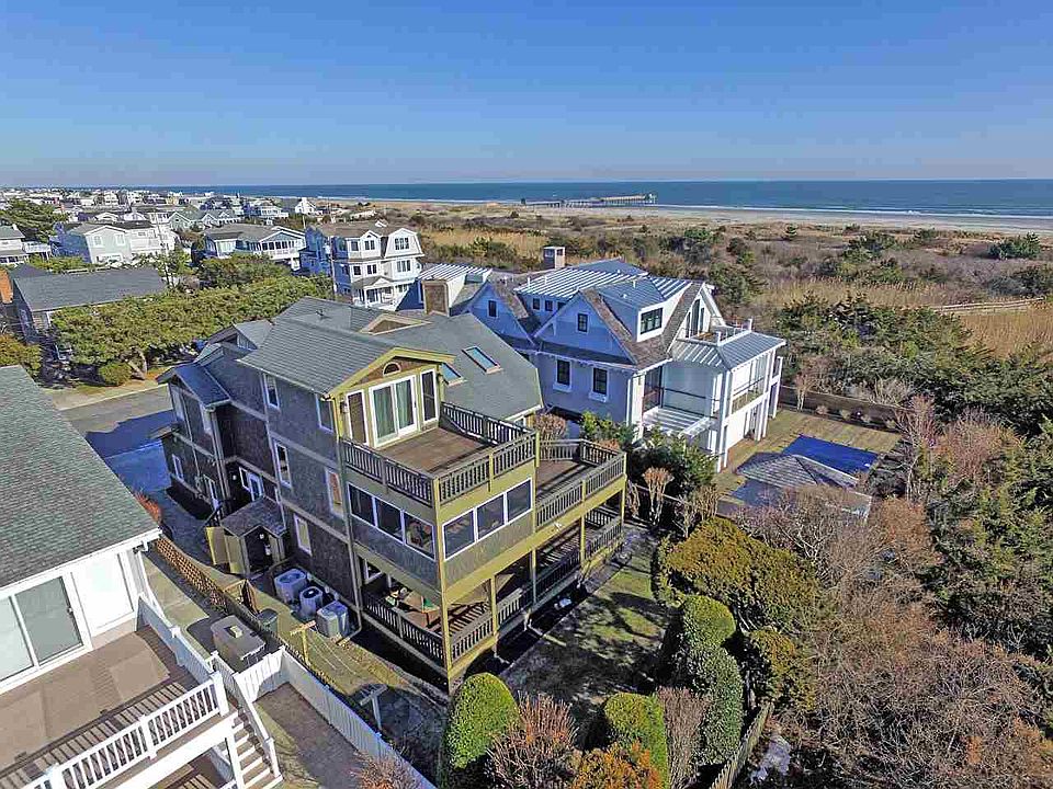 BEACHBLOCK-SECOND FROM BEACH. A very rare second from beach offering with a protected Dune Line that guarantees no one will ever build behind this home! As a result, the extraordinary ocean views are unobstructed and you see crashing waves down the coast. The spacious 3 story upside-down style has 5 generous bedrooms all with ensuite baths. The home has a newer stained cedar shake exterior, paver driveway and field stone walkways. The front entrance leads to a foyer with oak floors and a unique privacy screen, family room with wet bar with direct access to a large deck overlooking a beautiful rear yard with ample room for a pool. There are two generous bedrooms, each with ensuite baths on the first floor as well as a laundry room with exit to the outside shower. An oak staircase leads to the great room with hardwood floors which includes a vaulted living room with fireplace and built-ins; large dining area and spacious kitchen with granite tops and an expansive, two stage counter bar, perfect for entertaining. The great room has direct access to a fabulous southern exposed sundeck and screened in porch. The second floor has two additional bedrooms with ensuite baths. The master suite on the third level has the most SENSATIONAL vistas you will find in a beachblock home. The master is private, has a large walk-in closet, two decks for views looking north and south and a sumptuous natural stone master bath with jetted tub. Other special amenities include attached garage, gorgeous garden in season, 3 zone HVAC, windows to capture every beautiful ocean view and custom wood fencing that is very striking. The 34th Street location is a pristine neighborhood offering a beautiful and stable beach as well as walking distance to town. Home sold furnished, never rented and ready for your immediate enjoyment.