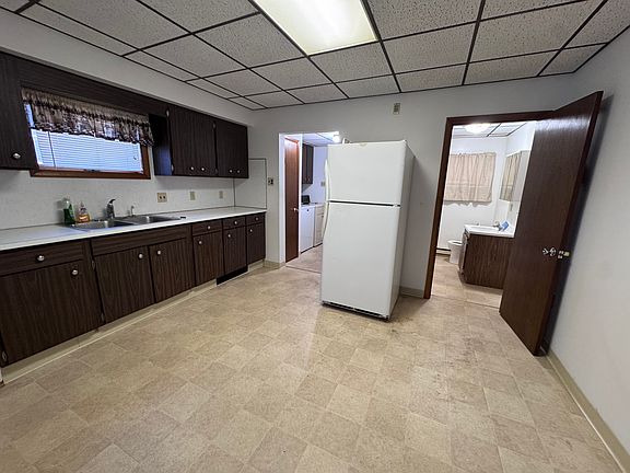 The kitchen is roomy and fully equipped with a refrigerator, double sink, and plenty of cabinet space perfect for cooking and dining in.