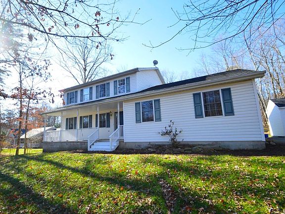 Wonderful 3 bedroom/2.5 bath Colonial with covered front porch located in Saw Mill Run Neighborhood. Move-in ready! Spacious living room connects to big eat-in kitchen with sliding doors leading to deck overlooking awesome wooded backyard. Perfect for outdoor entertaining! Family room, powder room & laundry room with entry complete main floor. Second floor boasts generous master bedroom with master bath, 2 additional bedrooms & a full bath. Tons of closet space throughout home. Full unfinished basement great for storage. 2 car attached garage & driveway provide ample parking. Entire property surrounded by trees gives nice privacy. Minutes to Routes 209, 476, and Beltzville Lake. Only 30 minutes to Allentown. Nothing else to do but move in! Make this well maintained home yours today.