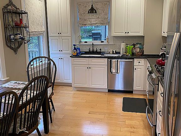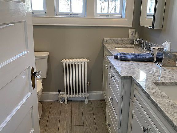 1906 Colonial. Wood floors and lots of wood work, stone exterior first floor with cedar shingles on floors2/3. Created new eat in kitchen in 2018 by combining kitchen and laundry room. Granite countertops, upgraded cabinets, stainless steel appliances, new french doors to back porch. Also in 2018, moved laundry to second floor, added first floor powder room w/granite floor, remodeled second floor bathroom with granite counter 2 sinks, glass shower with seat. Wrap around porch side and front, large fenced back yard. Excellent condition 2021 - upgraded electrical wiring throughout; installed 2 Zone AC; replaced hardwood floors; dry sealed basement; installed gas insert in fireplace, freshly painted entire interior of home 2022 - repaired/installed new underground sewer drain, new storm windows,