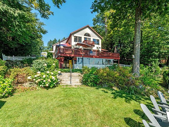 Stunning Lakefront Home with Breathtaking Mountain Views Welcome to a serene retreat on the shores of Lake Winnisquam, where luxury and nature unite. This lakefront property offers unrivaled views of the Belknap Mountain range and combines elegance with functionality. With four bedrooms and four-and-a-half bathrooms, it’s perfect for both intimate and larger gatherings. The main level features an open-concept living area with elegant hardwood floors, 60% are Radiant and a cozy woodstove, ideal for cooler evenings. The expansive wraparound deck offers panoramic views of Lake Winnisquam, perfect for morning coffee or sunset gatherings. You will love the gourmet kitchen and pantry which offers additional The master suite is a luxurious sanctuary with stunning lake views and a private en-suite bathroom, providing a tranquil retreat. The lower level boasts a spacious family room for relaxation and entertainment, plus a screened-in porch to enjoy lake views and sunrises uninterrupted. Additional features include an oversized 2-stall garage with 600 sq. ft. of finished space above, suitable as an office or guest suite. Direct lake access allows for boating and swimming on your private beach 78 ft. of Lakefront. 34 ft. U-Shaped dock and Mooring. Snowmobile and Ice Fishing on the Lake. Just 20 minutes to Gunstock! This home isn’t just a residence; it’s a lifestyle. Schedule a viewing today to experience its unique charm and natural beauty. This can be a multi-generational property!