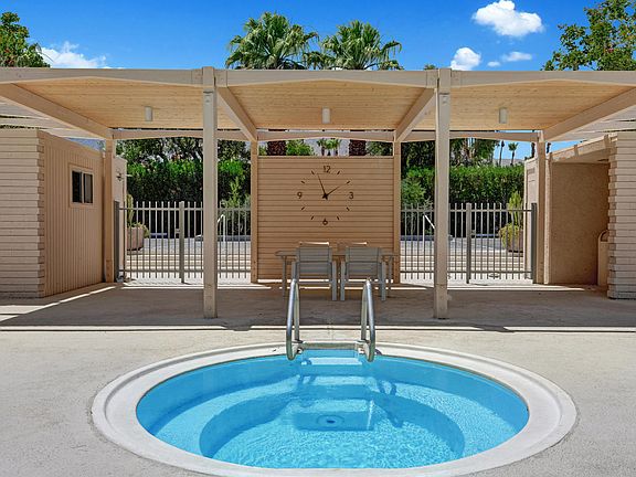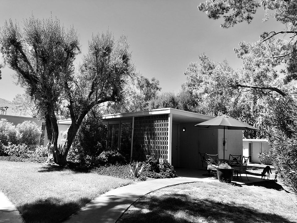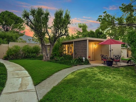 Located in the original historic Racquet Club Cottages West home of the stars, designed by William Cody, built by Paul Trousdale, landscape by Phil Shipley + Dudley Trudgett, the 37 charming cottages are secluded by mature lush landscaping w/palm trees, stream + mountain views. The resort-like the complex includes an architecturally designed pool + spa that is one of the largest + unique pools in Palm Springs. RCCV has been featured on MODERNISM WEEK many years. This charming and bright south facing cottage is tucked away making it extremely private and quiet. Incredible views with floor to ceiling walls of glass, classic mid-century straight lines with iconic brise soleil block wall create THE ultimate indoor-outdoor Palm Springs living. This 1BD/1BA is perfect and very comfortable for either a full-time residence or a pied-à-terre. Private South East patio for enjoying breakfast. Washer/Dryer off the patio. Incredible tax savings w/MILLS ACT due to Class One Historic District. You OWN the land. Short Term Rental (14 days minimum). HOA includes water, trash, roof, ext. walls. Near Uptown/Downtown, hip restaurants, shopping, bars, parks, golf, tennis, biking + hiking trails, more.