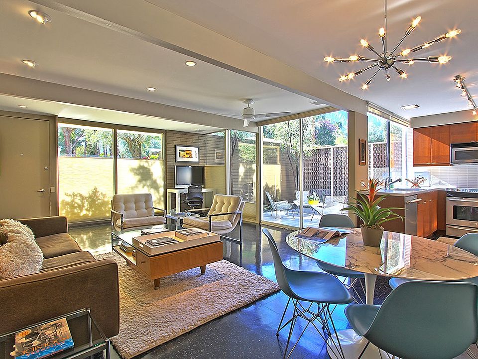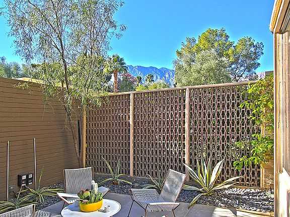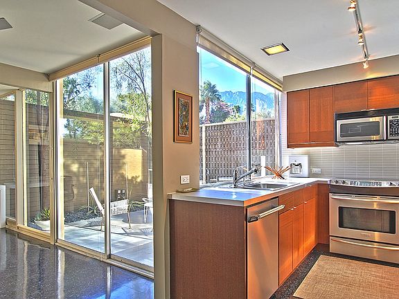 This gated, classic mid-century modern patio home is located in the historic Racquet Club Garden Villas, recently designated a historic district by the City of Palm Springs. Built in 1959 by Paul Trousdale, this condominium has been fully renovated yet remains authentic to the original William Cody, AIA design. The Garden Villas is a quiet, 37-unit development set within lush grounds designed by landscape architect Phil Shipley and featuring stunning views and a beautiful pool and spa area. Using post and beam architecture, this one-level condo has an open floor plan and features walls of glass throughout. This unit offers two private patios, mountain views from the living room and the kitchen. There is a large master suite with an additional semi-private den area (great for a pull out sleeper); each has their own private bathroom. Additional features include two-zone heating/air-conditioning, custom closets, built-in stereo. The patio landscape has recently been updated. - See more at: