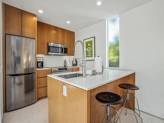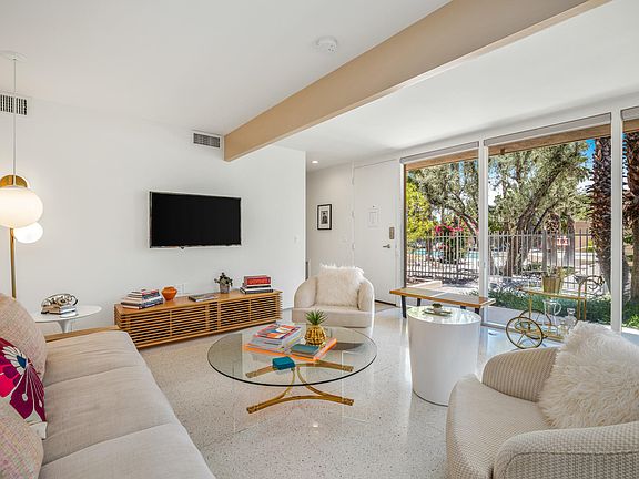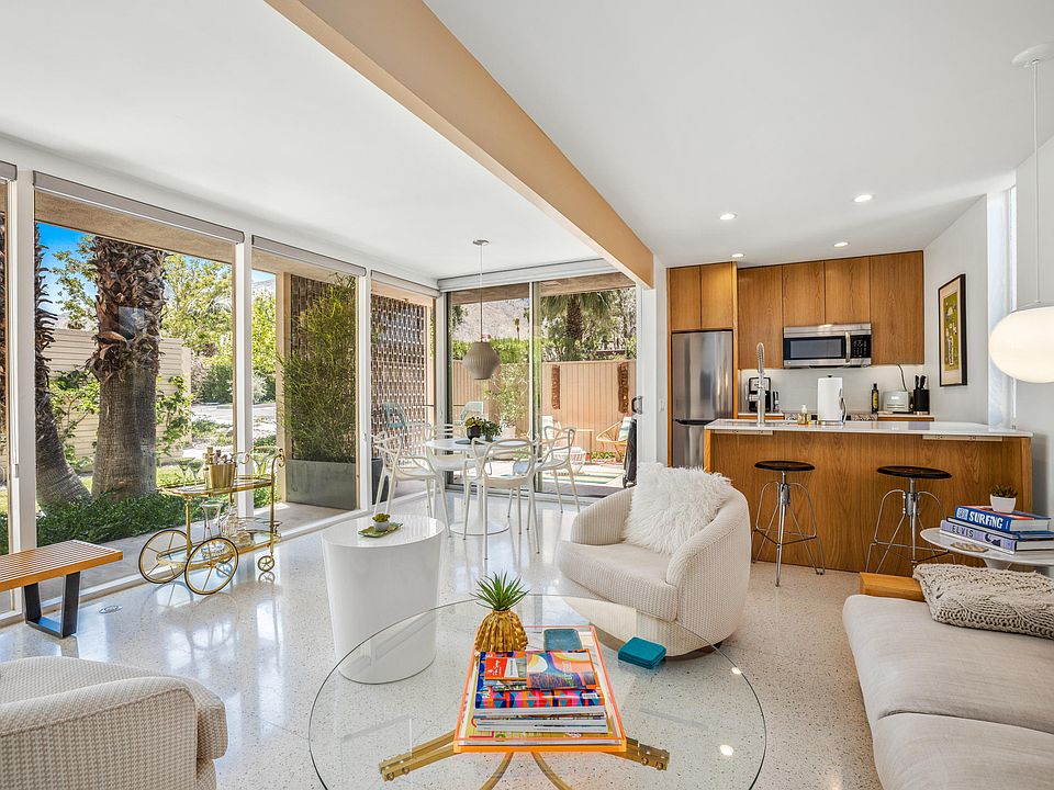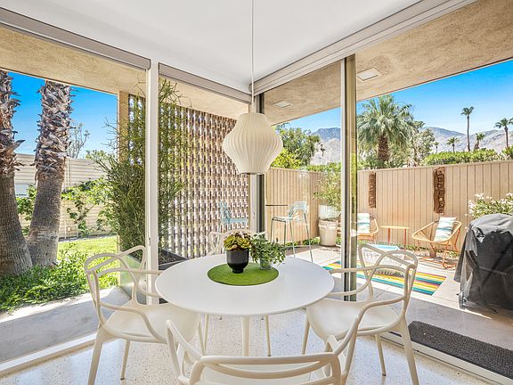 Private gated enclave of 37 historic bungalows, which contributed to putting Palm Springs on the map. This lovely desert oasis is quiet and secluded, yet minutes from downtown Palm Springs with its fabulous restaurants and trendy shops. Classic mid-century modern architecture designed by architect William Cody, set in gorgeous, lush mature landscaping (with palm trees, pool, hot tub and stream) by landscape architect Paul Trousdale. Beautifully and meticulously renovated to the highest standard, with custom white oak cabinetry, Samsung appliances, terrazzo floors, designer fixtures and a private garden patio. Large windows filled with natural light and incredibly beautiful mountain and pool views. This historic property has Mills Act designation (discounted taxes), and generates great cash flow as a vacation rental. FEE SIMPLE LAND!