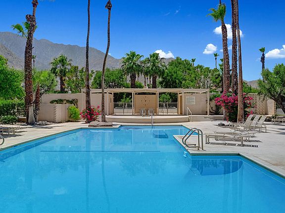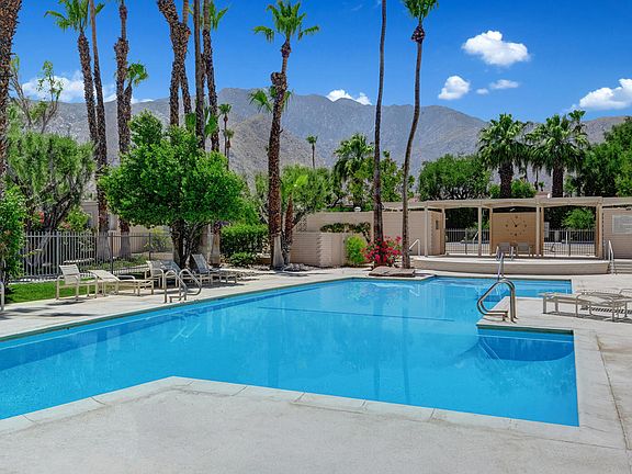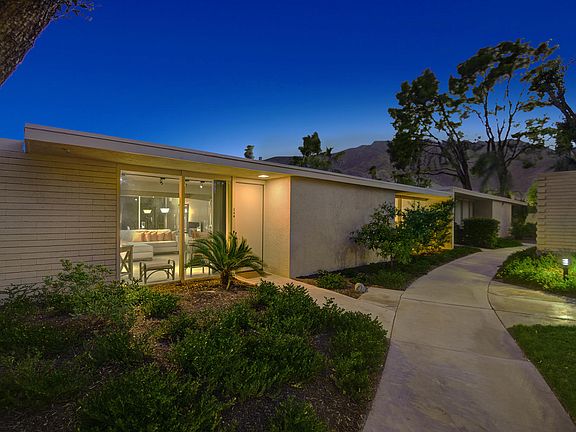 Located in the original historic Racquet Club Cottages West home of the stars, designed by William Cody, built by Paul Trousdale, landscape by Phil Shipley + Dudley Trudgett, the 37 charming cottages are secluded by mature lush landscaping w/palm trees, stream + mountain views. The resort-like the complex includes an architecturally designed pool + spa that is one of the largest + unique pools in Palm Springs. RCCV has been featured on MODERNISM WEEK many years. This cottage is extremely secluded and has one of the largest SqFt in the complex making it very spacious plus the floor to ceiling glass, 2 oversized enclosed and private patios w/iconic mid-century brise soleil create THE ultimate indoor-outdoor Palm Springs living. Upgrades are bountiful: kitchen, stainless appliances, counters, cabinets, lighting, enormous walk-in shower, double vanities, a great amount of closet/storage space, more. Perfect location, quiet, South facing, w/lots of natural light. Incredible tax savings w/MILLS ACT due to Class One Historic District. You OWN the land. Short Term Rental (14 days minimum). HOA includes water, trash, roof, ext. walls. Near Uptown, restaurants, shopping, bars, parks, more.