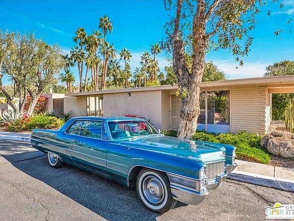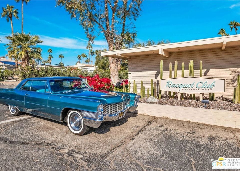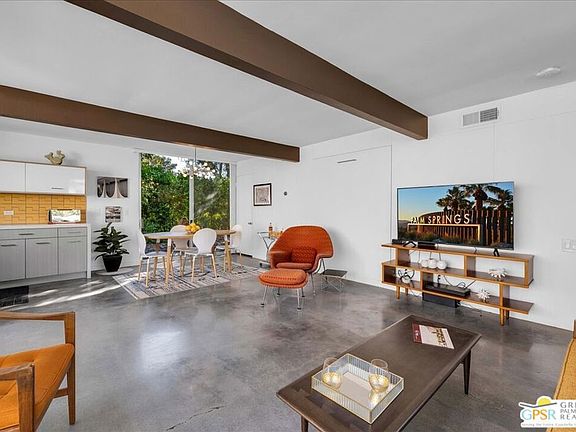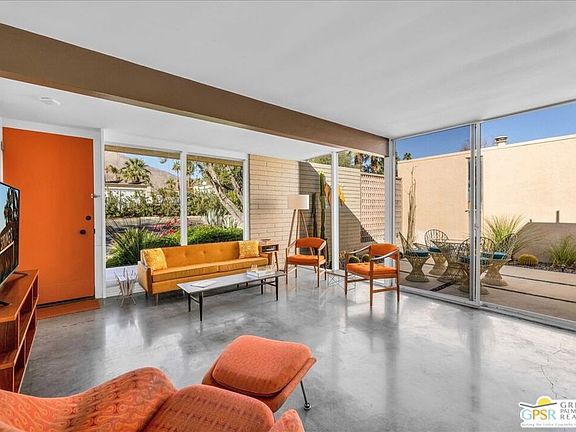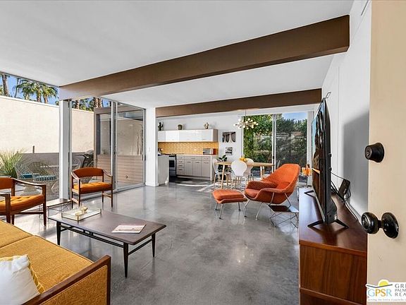 In 1964, Paul Trousdale, a prolific builder in Southern California, commissioned Mid-Century famed architect William Cody to design the beautiful complex known as Racquet Club Cottages West (formally Racquet Club Garden Villas). Secluded behind gates, there are 37 cottages nestled among palm trees with lush landscaping, meandering sidewalks and a gentle stream. The beautiful pool and desert oasis landscape were designed by Philip A. Shipley. This is one of three free-standing larger units within the complex. This renovated unit features floor to ceiling windows, polished cement flooring, quartz countertops, a large primary bedroom, office, walk-in shower and two private patios complete with William Cody designed breeze block. There is a hidden Murphy bed allowing flexible sleeping arrangements for guests. Sold turn-key furnished, the unit features curated Mid-Century and contemporary furniture. The property is designated a Class 1 Historic site, providing a substantial tax reduction. Fee-simple land (you own it). HOA fees include water, trash, roof, exterior walls and care of common areas. RCCW has a 14-day minimum rental policy.