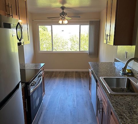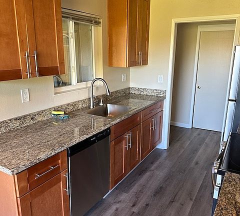 Large 2BR Garden Apartment. All new kitchen: granite countertops, cabinetry, dishwasher, microwave, oven/stove, refrigerator. Hardwood floors. Private balcony, assigned covered parking, spacious storage unit, locked bicycle cage, laundry room (w/ app controls). Walking distance to Cal-Train, Cal Ave. shopping & dining, Stanford University, downtown Palo Alto. Resident manager on site.