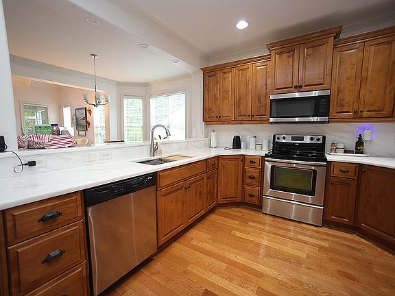 SPACIOUS END UNIT TOWNHOME IN CHARMING LAKESTONE VILLAGE! You will love quiet nights out on the huge screen porch backing to a wooded buffer. This unit feels so private. So many custom features built into this home. Expansive hardwood flooring in this open floor plan flooded with natural light. First Floor Owner Suite with luxurious bath, extra large tiled shower, cathedral ceilings throughout. Custom features include glass paned front door, heavy moldings ,new marble countertops, stainless appliances, blinds and more. The 2nd floor features two generously sized bedrooms, a bonus loft area and floored walk in storage. The upstairs bath is tiled, with large tub & counter height vanity. All closets feature quality wood shelving. Only a few townhomes were built in Lakestone Village so this is a rare opportunity. You can see and feel the solid construction and upgrades. This community offers a pool and playground. Minutes to Fuquay-Varina downtown and Main Street and the new section on 540! A must see!
