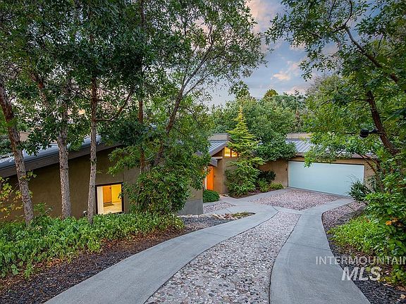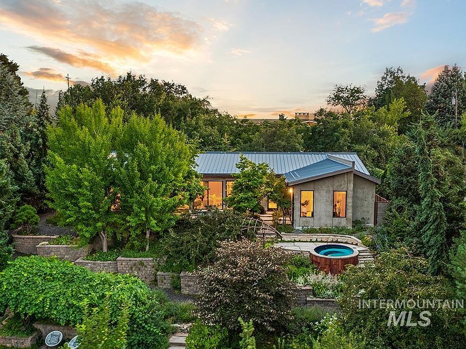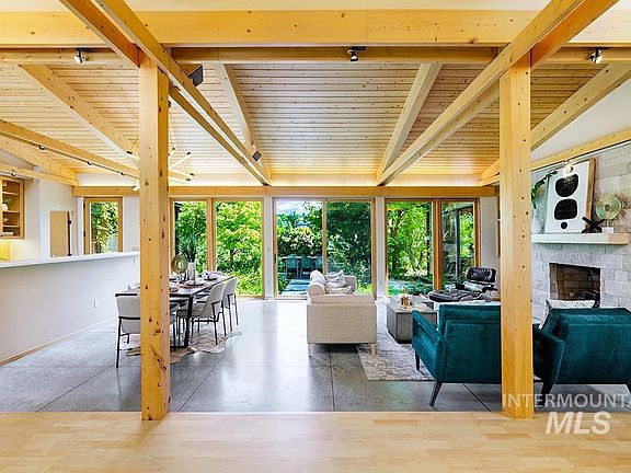 An architect's personal refuge in premier Boise Heights! Nestled into a graceful enclave of privacy, this ~1/3-acre homesite is the product of a local designer who spent years cultivating his most deeply personal project yet, one that evolved into a canvas for stylized expression and a catalog of architectural ideas. The brilliant layout was designed to wrap around the cottage garden setting, where panes of glass frame the verdant views and foothill surroundings like a piece of living art in nearly every room. The interior is adorned in light and natural materials in their purest form, including concrete and birch floors, 15 ft vaulted ceilings clad in white spruce, custom-milled beams, and native stone elements that create streamlined, materially rich spaces throughout. The primary suite sits on a wing of its own, under wood-wrapped vaulted ceilings with expansive view windows and doors that infuse the room with morning sunlight and offer direct access to the patio.