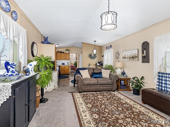 Extremely well kept and cared for 14x70 2 Bed, 2 full bath home with a wide-open floor plan and cathedral ceilings. Updated kitchen with new counters, new backsplash, pantry, and all appliances included including brand new refrigerator Primary Suite with walk-in closet and private full bath. Newer floor coverings throughout. Main Floor Laundry. Home is very sound including new roof 3 years ago. New Central Air 3 years ago and a 10x10 shed. Desirable location in the community on large lot at south rim and wooded backdrop. Canterbury Estates offers a full clubhouse w/ inground swimming pool, fitness area, basketball courts, and play area. Located near schools, parks, and retail strip. Hurry to show! Note: Community approval required.