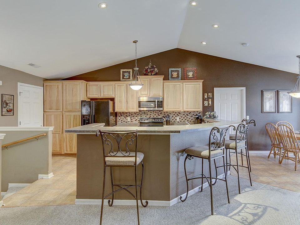 Welcome home to this beautiful 3 bedroom, 2 bathroom, upper unit with vaulted ceilings. This former builder's model is a fantastic showcase and features a large open-concept Kitchen / Dining / Great Room. Huge breakfast bar is a great entertaining area. Kitchen has glass tile backsplash & hickory cabinets! Cuddle up in front of the gas fireplace with STUNNING brick and decorative wood trim. Relax with views of the beautiful trees on your private patio either in the sun or in the shade, as the patio is half-covered. Great location is easy for commuting and is walkable to schools, grocery store, etc. Updates include A/C (2017), microwave (2017), water heater (2012).