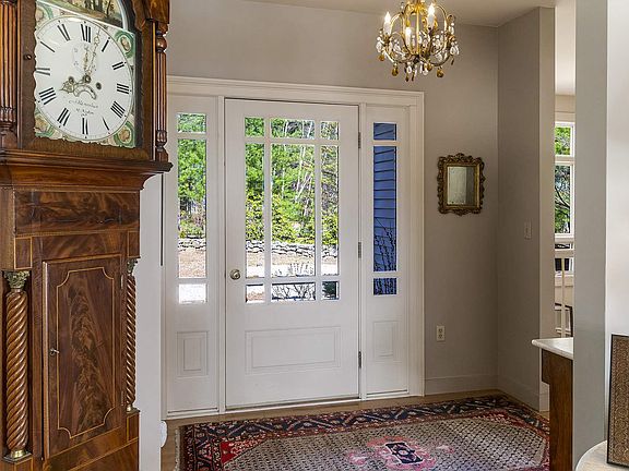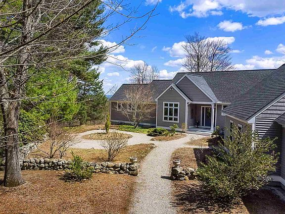 Finely detailed craftsmanship designed by well respected architect. Wayne Skinner, make this hilltop California Contemporary truly one of a kind. Watch the sunrise every morning from a commanding expansive eastern view beyond the gardens and field from every room. A lovely courtyard welcomes guests or enter through the covered walk from garage to mudroom and gourmet kitchen. The floor plan opens from dining to sitting rooms with gas fireplace for easy entertaining. A sunroom overlooks patio, non-stop flowering beds, koi pond, waterfall and out into the wildflower meadow. The master suite has a private wing including large bedroom, office corner, bath and private deck overlooking the view of the beautiful landscaping. The lower level has two generous bedrooms that share a full bath, office, gathering room with walk out to patio and another bedroom suite with bath plus a mini kitchen to serve guests on the patio or to create an apartment for in-law or an older child with door for privacy. All have double closets and more storage in attic and utility room. Three car garage, 8 zone irrigation, dual HVAC to serve each level and custom made moldings and cabinetry. Close to the Federal Hill Trail area for extensive hiking or biking trails. Plus snowmobiling in winter! The 5 acre lot close to historic Monson Center was once part of a girls' camp in the late 1800's. Now your private retreat set back off the road to enjoy life at the top of the hill.