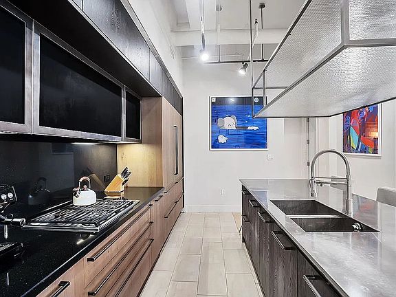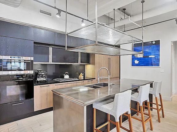 The custom Italian kitchen, made by Diesel with Scavolini, has been designed as part of their Diesel Social Kitchen collection. It features Ruxe grey and black wood veneer cabinetry and drawers, stainless steel drip metal finished countertops, and top-of-the-line appliances such as double Subzero refrigerators, and Wolf stove/cooktops. Adjacent to the main area is a large bedroom which is currently being utilized as a home office with access to a full bath that has been custom designed by Restoration Hardware.