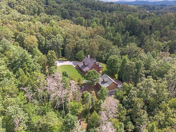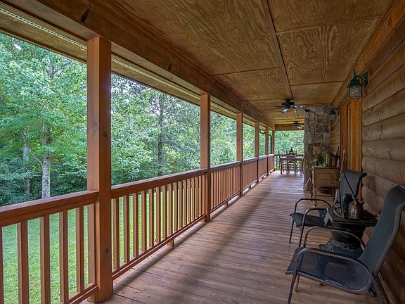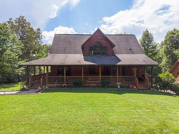 Private with a beautifully landscaped front yard sits this log home with a 3 sided wrap around porch. Enter thru French doors into the dining room, then the living area to the left w/ a stack stone gas log fireplace w/ Maple flooring. The kitchen has tile floors, custom white hickory cabinets, tile backsplash, an island, pantry & breakfast nook. Also on the main level is the master en-suite w/ stack stone & tile walk-in shower & shoe closet. The upstairs floors are Hickory w/ 2 lg. bedrooms containing built-ins for storage, plus additional storage behind the closets. Also a bonus room w/ lots of natural light that would make a great office or craft room. In the basement is the family room w/ vinyl plank flooring, shiplap walls & ceiling and a stack stone fireplace plus another full bathroom. The other half of the basement is a large craft room and lg pantry w/ freezer. Two other buildings on the property: one currently called the "Party House" is 31 x 23 w/ vaulted ceilings, hardwood floors, 1/2 bath & kitchen area & below is a dream 600 sq ft workshop; the second building is a "treehouse" w/ hickory frame, windows and laurel railings around the porch.
