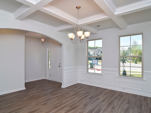 The Palmer is a four bed, two-and-one-half bath home with an open floorplan. Walk in to your new home to see your formal dining room with beautiful coffered ceilings and a large butlers pantry that leads to the kitchen. Your new kitchen features upgraded white cabinets, granite countertops, recessed lighting, a large single bowl kitchen sink perfect for big pots and pans, under-cabinet lighting, and a gas stove. The kitchen island is perfect for extra seating, and is large and open to the eat-in and family room. Relax in your sunroom that overlooks your private backyard. Head up the beautiful wooden stairs with metal spindles to three secondary bedrooms and a large master suite. The master suite hosts a luxury bath with separate tub and shower, double vanity, and large his and her closets. This home also has an unfinished basement!