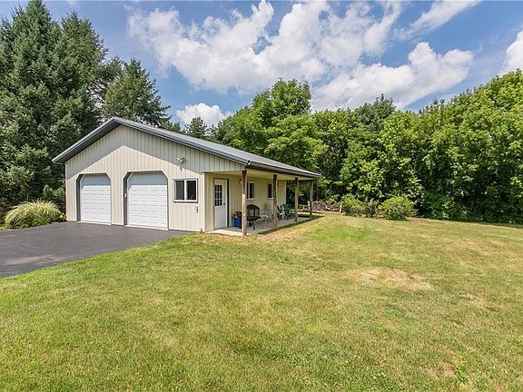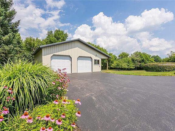 A peaceful, private haven tucked away on >5 acres only mins to village, Wegman's, mall, Thruway, X-ways, city. Bright & airy 4bdrm 2.5bath colonial, views from every room. Attached 2-car garage plus pole barn with 2 bays. Excellent condition in & out. New "Birch Driftwood" engineered hardwood floor thruout foyer, liv rm, din rm, kitchen. New neutral carpet 2nd floor. Remodeled kitchen: hickory cabinets, neutral Corian counters, gazebo-style dinette; appliances included. All baths have been updated. Enclosed porch. Rec rm in walkout bsmt adds 800 sqft. High-eff heat & cool system 5 yrs old. Fairport electric, gas @ road. Recent gutters & tear-off roof. Land is mostly flat, some gentle slopes, some wooded, much open. Perfect potential sites for barn, trails, tennis court, pool, veg garden.