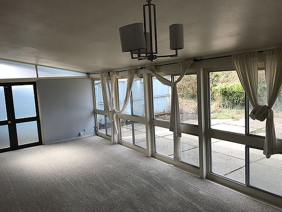 Custom built mid century modern with extensive updates and remodeling throughout. New carpet in the living room, dining area, and hall. New luxury vinyl plank flooring in the bedrooms, den, and finished daylight basement. New interior paint throughout most of the house. Kitchen updated with new countertops, stainless steel appliances, and vinyl flooring. The house has vaulted ceilings in the living room, dining area, kitchen, den, and master bedroom. The master bath is updated with new luxury vinyl flooring, new toilet, new sink and cabinet, and has a skylight. The den has a large skylight which opens, and a closet so it can be used as a bedroom making it a 5 bedroom house, but the den does not have a window. Each bedroom has built-in drawers, and two bedrooms have built-in desks with lights above. The kitchen does have an original dumb-waiter to the basement, but it is not operable. The front has a private deck area, and the rear has a large patio.
