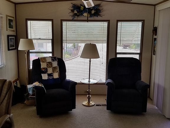 • Ideally situated at intersection of two streets; backs up to trees/vacant land, afternoon shade • Fully furnished—everything you need to move in now: 1 bedroom/underbed storage/over-bed lighting, 2 large closets; 1 large bathroom/large glass-enclosed shower; open floor plan, ceiling fans, pantry, sunscreens—front windows, awnings—front/side windows, abundant storage throughout • 40 gal. water heater, new garbage disposal, built-in microwave, updated faucets/interior walls/floors/ blinds, covered back patio/bar-b-que/floodlights, front yard watering system, wired for DishTV in AZ room/park model, full propane tank—owned, not rented • Arizona room: shed, workbench/tools, washer/dryer, 2 window air conditioners, treadmill, craft/computer areas, shelving, laundry supplies • 55+ RV park--Venture In, open May-October, annual rent paid in May; 2015: $3300; non-pet area