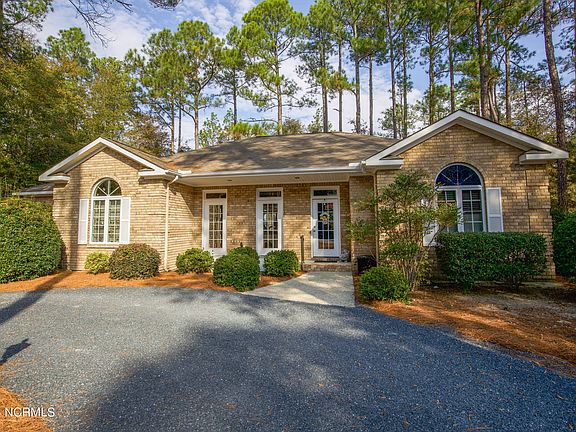 This all brick, impeccably maintained home has so much to offer. From the location on this desirable Pinehurst street, just minutes to the heart of Pinehurst Village to the option of a transferrable PCC membership (buyer to pay transfer fee). Low maintenance home, level flat yard with circular drive and side load garage showcases great curb appeal from the start. The attention to detail continues inside with a foyer, crown molding throughout, double ovens, cook top, center island in kitchen, laundry complete with cabinetry and sink. Split bedroom plan with primary with walk in closet on one side of the home with dual vanities, separated by a linen closet, soaker tub and shower. The second bed and bath on the other side of the home offers a cozy space for guests. The den with built ins provides another space from the living room to relax. Pitched ceilings, ceiling fans and abundance of light through the beautiful windows and doors with transoms create a warm and inviting home. Enjoy the outdoors on the oversized concrete patio overlooking a wooded backdrop. This was a progressively designed home for the time period it was built. So many features that are in demand in homes built today. A video tour is available.