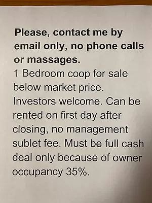 Please, contact me by email only, no phone calls or massages. 1 Bedroom coop for sale below market price. Investors welcome. Can be rented on first day after closing, no management sublet fee. Must be full cash deal only because of owner occupancy 35%