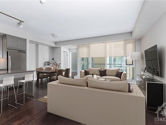 Opportunity knocks when you own one of the largest one bedroom units in the building. it is almost 800 sq ft, including the balcony, this south & west facing unit boasts 9 ft ceilings, floor to ceiling windows, a handsome great room & bedroom and bath with access to ensuite laundry. The sun filled great room is anchored around a contemporary kitchen breakfast bar, quartz counters, SS appliances and a study nook. Completing the unit is a large bedroom with west facing floor to ceiling windows overlooking a beautiful courtyard below. The building boast Yoga, plates & fitness Centres, Business & Theatre rooms & ground & roof-top terraces with ample lounges to relax & a BBQ & private hot tub on the top terrace. Amenities include a pet grooming & bike tune-up rooms. Step out you door and immerse yourself in the vibrant hum of Westboro. A short stroll for a latte or bistro lunch invites you to the charm of this sought after neighborhood. Two photos have been virtually staged.