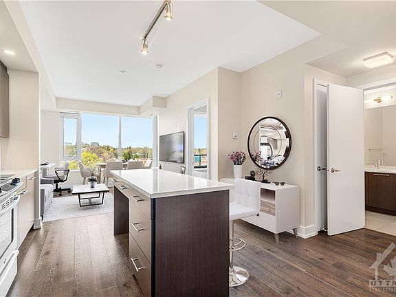 Modern quiet sun-filled south facing condo with 1 bed, 1 bath, 1 Large Underground Heated Parking, 1 Locker, Private Balcony, 1 Bike Locker, located in Westboro/Island Park. Open concept unit with 9' ceilings, luxurious hardwood floor throughout and oversized windows let tons of natural sunlight in and make the space bright and inviting, custom blinds, kitchen quartz countertops, large kitchen island with tons of storage and dining for 4, soft closing cabinets and drawers, and stainless steel appliances. No pets lived in and never smoked in. Amenities include fitness and change room, yoga studio, sauna, steam room, bike/ski tune up station, party room with kitchen accessing the courtyard patio, theatre, private courtyard with fire pit, rooftop terrace with BBQ/lounge chairs, hot tub, pet grooming station, and visitor parking. Steps to shops, groceries, restaurants, cafes, Westboro beach, parks, LRT and buses, bike paths, natural trails, Civic Hospital. Some photos virtually staged.