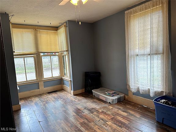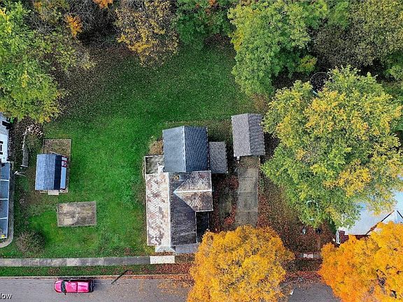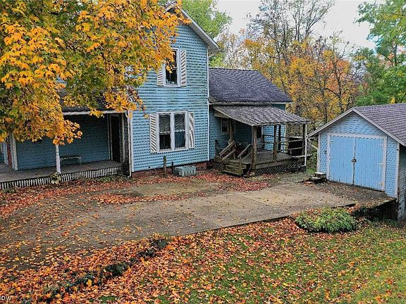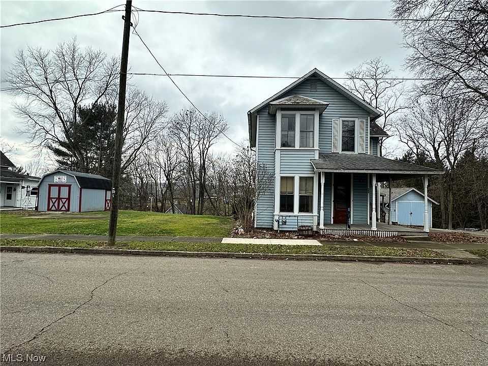 Stunning two-story home on double village lot with charming half wrap around porch. Paved driveway with plenty of parking. Large living room with alcove window. The dining room and foyer both have beautiful stained glass style windows. Oversized eat in kitchen with easy access to the side porch, perfect place to set up a grill. Custom Schrock Kitchen Cabinets. All kitchen appliances will stay. Bedroom, laundry and a full bathroom complete the first floor. You will notice this home used to be set up as a duplex. The Alcove style window is extended to the second floor. The 2nd bathroom will need finishing touches to be used again as a bathroom. Potential 2nd kitchen with laundry hook up. Outbuilding and shed offers plenty of storage.