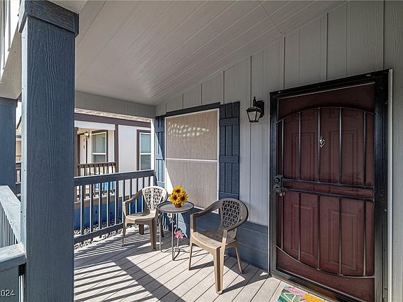 Welcome to this pristine gem in a 55+ gated golf course community! Just doors down from the dog park, this home is a dream for pet lovers. Enjoy a completely enclosed and covered back patio with a dog door, concrete pad, artificial turf, and a water hose bib—ideal for your furry friends. The home features an extended front porch, a driveway with more parking room than most, and modern touches like security screen doors, solar screens, and window tint. Inside, you'll find pendant lighting over a spacious island with extra storage, vinyl flooring, and granite countertops. Stainless steel appliances, ceiling fans in every bedroom and living room, and stylish vanity lights complete the look. Boasting meticulous care and pride of ownership, this home includes a shed for extra storage. With mountain views all around, you can relish in the community's amenities such as: exercise room, pool, jacuzzi, bocce ball, and more. Don’t miss out—bring your fur babies and make this house your home!
