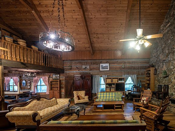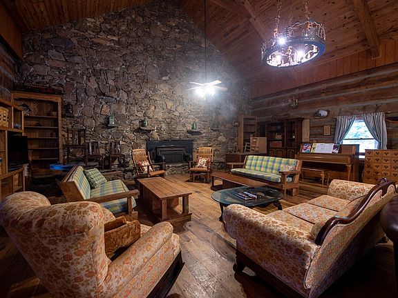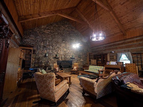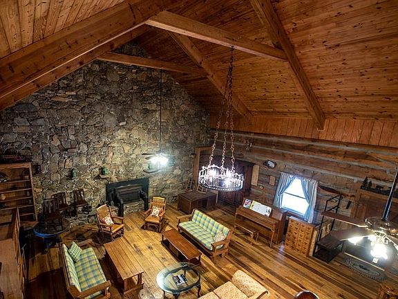 Space, privacy and nature abound in this ultimate retreat for a very large family, overnight excursion club, bed and breakfast, limited only by your imagination. The main living room is just gorgeous, stone wall on one side and ceiling and walls all stained wood gives a rustic castle feel. The doors are solid wood with handcrafted hinges, the attention to detail is remarkable. This 4000+ home with 2 bedrooms and 3 bonus rooms has 2 bedrooms and 1 bonus room in the main house, 2 bonus rooms with 1 1/2 baths above the 2 car garage, and is spacious, with high quality construction and materials. Covered porches, large decks and hot tub, 1.22 acres have been surveyed out of the 17.15 parcel, see survey for property lines. This is a must see, a true relic of quality building. Main house has oil furnace and beautiful fireplace, garage loft has heat pump. All offers considered.
