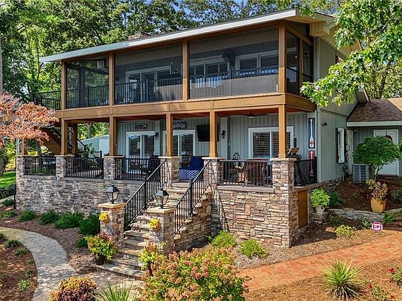 Lakefront EXTENSIVELY remodeled Home! Double Lot w/ 2nd Living Qtrs & Double-Deck Dock/Gorgeous LONG range VIEWS w/ manicured irrigated lawn & landscaping/Outdoor UPPER LEVEL HOT TUB! PLUS 846 HTD sq ft 2 1/2 car detached garage PLUS 633 HTD sq ft apartment up + FULL BATH! Custom Plantation Shutters/Level 4 granite, matching lighting w/ copper sink & outdoor gas lights on stone pillars! Tankless water heaters! Garage/Apartment excellent for entertainment/AirBnB/Camper hookup for guests! Partial steel Frame home! HOT & COLD water outside for washing your TOYS! Deep water year around, excellent lighting, tiki bar, dock w/ power & water/16+ ft at full pond! Four porches, with TVs & can entertain 35 to 45 comfortably! Porches have moisture shield material & ducks-back flooring, stamped concrete. Upper screened porch - primary bedroom! Great fishing - release area from fishing tournaments nearby! Minutes from public boat launch & lakeside fuel for easy watercraft adventures.