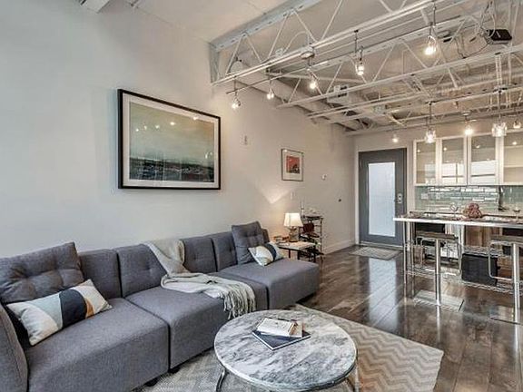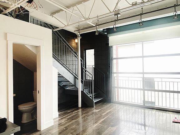 This 2 bedroom, 1.5 bathroom condo features soaring ceilings, neutral tones, striking exposed details, and an abundance of natural light with thoughtful updates found throughout its 2 story layout. A unique light-up glass floor in one bedroom overlooks the main level below, where you'll find the kitchen, half bath, and living area framed by a dramatic full-wall window that opens completely, garage-door style.
