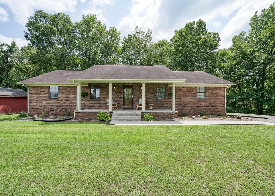 Come check out this all brick ranch that is tucked at the end of a dead end road on 7.97 acres that offers privacy, ample wildlife, quiet surroundings and a 3000 sq. foot pole barn that has water and electricity. The unrestricted acreage is partially fenced and has a watering system in place, so ready for all of your livestock. This retreat is within 10 minutes to Dale Hollow Lake, Cumberland River and the City of Celina. The home features an open concept with vaulted ceilings, split bedroom plan and is right at 1800 sq. ft. Primary suite offers vaulted ceilings, a large walk-in closet, private bath with double vanity sinks and a gorgeous tiled shower. Guest room with walk in closet and dual sinks in guest bath. Wonderful covered front and back porches surrounded by mature trees lets you enjoy country living at its best!