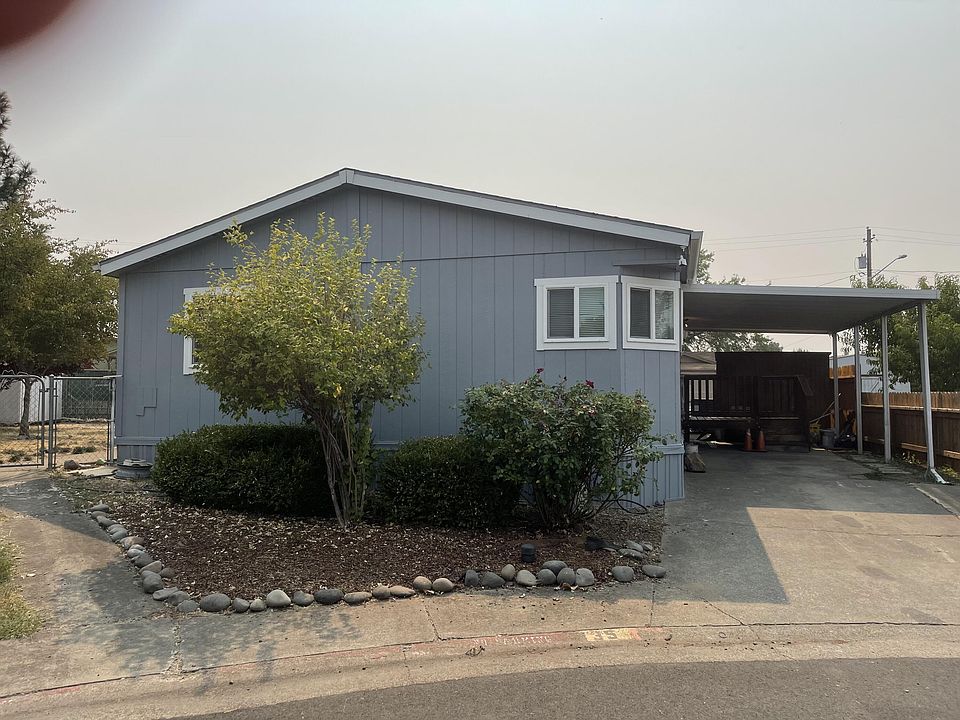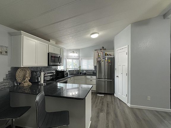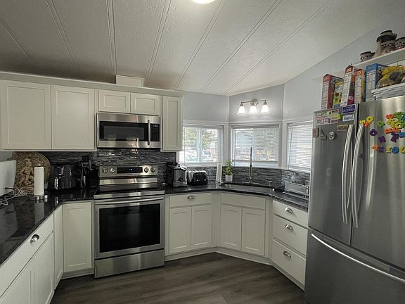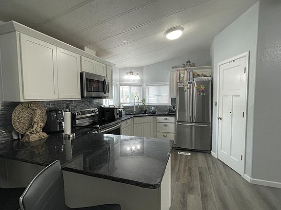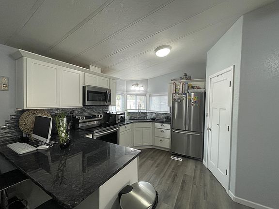 Motivated Seller! Aloha Sun All-Age Mobile Community. Fabulous updates throughout this 3 bedroom 2 bath home. Granite countertops & glass tile backsplash in the light & bright kitchen, new Shaker cabinets, new windows & lovely 3-window installation at the kitchen sink. Newer SS Samsung appliance package with existing appliance warranties, large walk-in pantry, tile & stone updates in both baths, jetted tub in the main bath, new plank flooring throughout, stone mantel & electric fireplace in the living room, new paint throughout, new central air, new forced air heat system, oversized laundry room, TVs, dining table set & sectional sofa included. Large backyard is fenced and has several shade trees & ready for the a.g. pool or play set. Big outdoor patio is great for BBQs or entertaining. Covered carport & storage shed. Visitor parking close by for friends & family. Conveniently located in White City near schools & shopping. A must tour! The seller went all out with the upgrades.