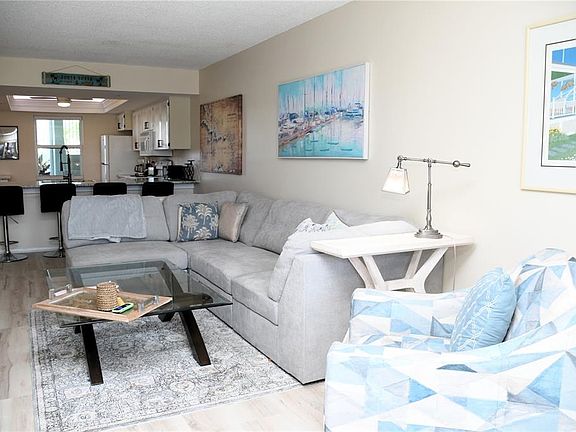 Waterfront condoScreened lanaiBreakfast barTasteful coastal decorEnsuite bathIn-unit laundryBright open layout