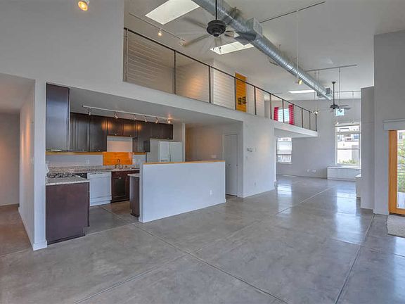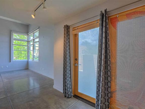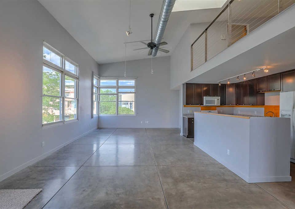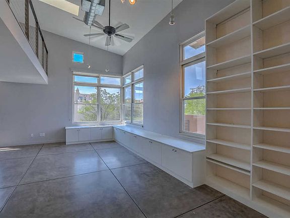 Santa Fe Contemporary home with private stairwell entry in The Lofts. Private interior steps to living area. Two balconies. Two 3/4 baths. One bath on each floor. One bedroom loft area. Large walk-in closet in the loft area. Add more bedrooms. Creative space for you. The Lofts are live/work and/or residences. Unit 408 is residential and can be commercial. Utilize 'back road', within short distance to shopping center on Zafarano. One of the larger condos in the community. Radiant heat with Refrigerated Air. Scored concrete floors. Bookshelf with custom white cabinets. Exterior Storage shared unit with separate entrance. Landscaped and dog park in community.