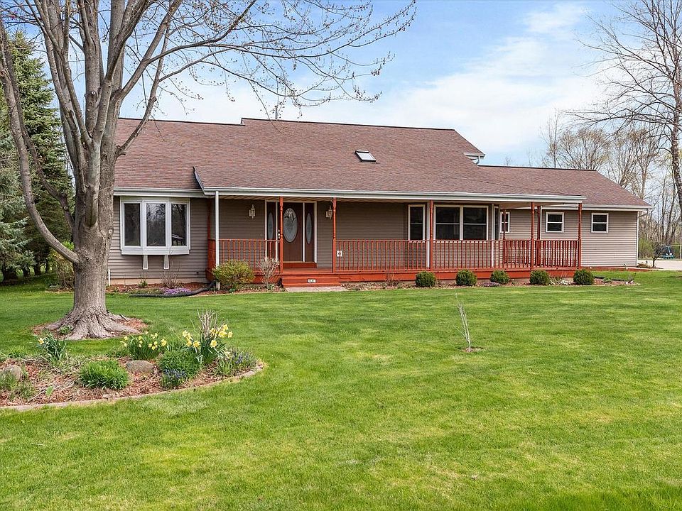 Huge, 2470 sq. ft updated ranch with another 1320 ft. of finished space in the lower level! Light filled, open concept floor plan with cathedral ceilings & skylights in kitchen, dining, living room & 4 season heated sunroom. Natural stone fireplace with gas igniter. Large kitchen with abundant cabinetry & pull out shelves. 3 full baths. Large upstairs laundry. Relax in your outdoor pool or the hot tub while enjoying the secluded views of trees & wetlands on your .75 acre lot or sit on your oversize wrap around porch or have a game of pool in your finished lower level with kitchen, den and bath. New: Roof on house & shed 2010, Furnace 2016, Hot tub 2019, New bathroom flooring & MBR shower 2020, Time saving features: underground irrigation system, leaf filter & retractable awning on deck.