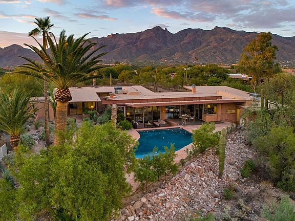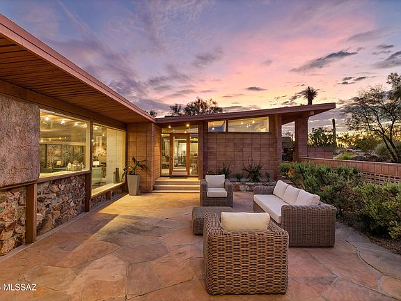 Where iconic modernist design meets the spirit of Tucson desert living. A stunning mid-century home built in 1958 designed by the distinguished architect, Nick Sakellar. Sited on 1.3 acre elevated lot w/ views from every room in the house. Last remodeled in 2000 & retaining its integrity. Gracious sized rooms & walls of glass protected by wonderful, deep covered patios. Unique open beamed ceilings throughout & a breathtaking stone wall & fireplace in the living room - a beautiful wall extending to the outside separated only by glass and enough built-in bookcases to make any bibliophile happy. Throughout the living area are rich, black slate floors. On cooler evenings you can dine on the covered patio overlooking the pool & city lights below or from the front courtyard you can enjoy watching the mountains turn blue, pink & lavender as the sunset casts its light on the Catalinas. This is definitely a desert home to be lived in & loved; to entertain or to enjoy solitude and the quiet of the desert; for dining w/ friends or curling up with a wonderful book.