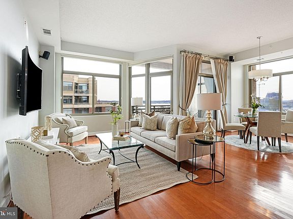 OPEN HOUSE CANCELLED - UNDER CONTRACT!!!!!! Welcome to the Eclipse, a modern condo complex located in Arlington just minutes from Old Town Alexandria and the Amazon Headquarters! This two bedroom, two full bath plus den corner penthouse unit is on the 10th floor and one of the few that boasts sweeping views and a 400 square foot patio overlooking the Potomac River. The entrance opens to the den/flex space that’s perfect for an office, music or sitting room. The open galley kitchen has granite countertops and updated stainless steel appliances with lots of counter and cabinet space. The living and dining area has floor to ceiling windows with expansive views of the river. Sliding glass doors open to an exterior covered balcony. The large primary bedroom has two separate closets and an ensuite bath with dual vanities, soaking tub and glass enclosed shower. The bedroom opens to the expansive private patio with room for outdoor dining, gardening or entertaining. The second bedroom is large enough for a bed and sitting area and includes a spacious walk-in closet and full bath. The home has hardwood floors in the main living area and primary bedroom and high ceilings throughout. The unit conveys with 2 garage parking spaces and a storage area. The building adjoins the Four Mile Run Trail which is perfect for biking, walking and jogging and connects you to the W&OD and Mt Vernon trails. It’s only a 10-minute walk or quick bus ride to the new Potomac Yard Metro or Crystal City Metro and you are minutes from DC, Pentagon, Old Town Alexandria, National Airport, shops and restaurants. Eclipse residents enjoy front desk concierge services, fitness center, swimming pool, community room, grocery store and medical offices in the building, a playground, and a rooftop terrace.