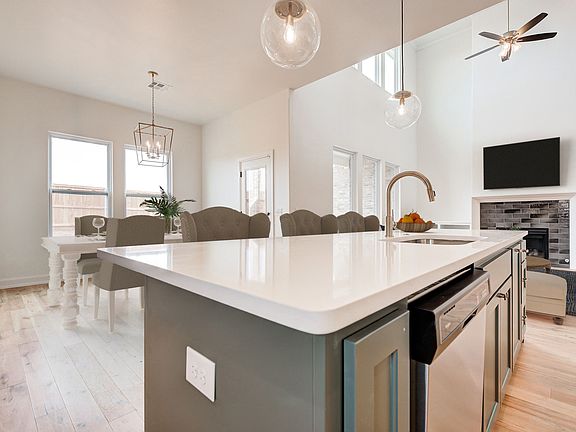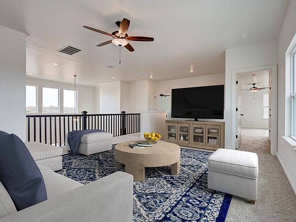 This two-story floor plan comes with lots of extras, such as a game room and a 2-story living room. The open living space includes a spacious kitchen with an island, plus a living room with a fireplace and a dining room that accesses the rear patio. This level also has a flex room and an owner's suite with a large walk-in closet. Upstairs, the gameroom and three additional bedrooms make a great getaway for kids or guests. A 3-car split garage is included; plenty of room for a home shop or storage.