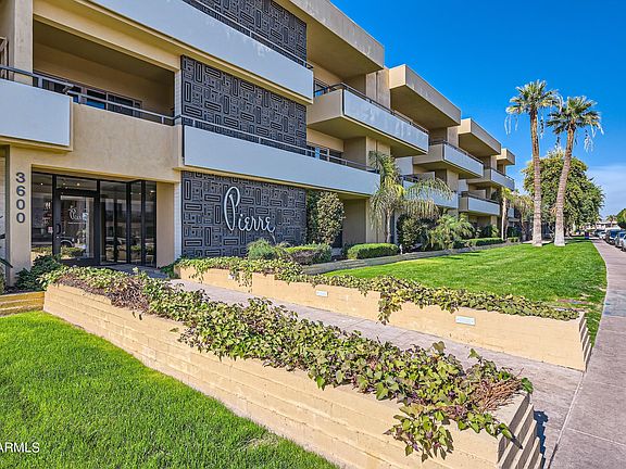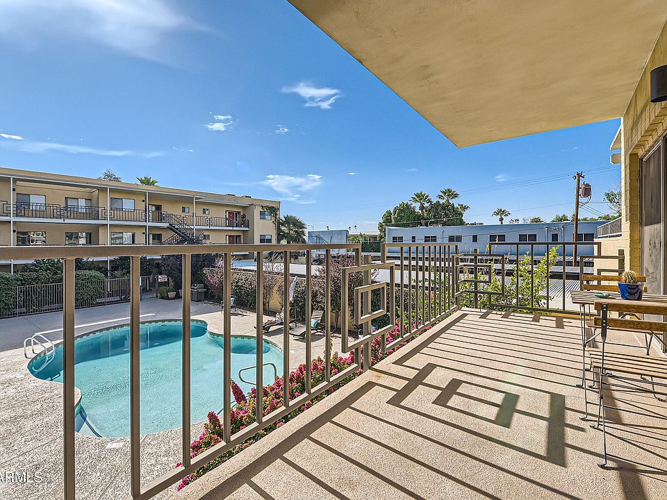 Live in the community with the coolest mid-century vibe you'll find in all of Midtown Phoenix. This updated 1-bedroom 2nd floor condo has a fabulous interior corner location overlooking the pool and is the ONLY unit w/ an oversized 20'x17' private deck & pergola plus a 2nd balcony, both making the functional living space far larger than the 914 interior sqft. Spacious & open Living Room with 2 sliding patio doors; Kitchen features granite counters and stainless steel appliances; Separate tub and shower; Tons of storage space; 1 gated & reserved parking space (#16); Elevator access; Pierre on 5th Ave is an intimate community of only 25 units, has a private & secure building lobby, and is located just steps from grocery shopping and more, plus near the Light Rail stop & all Midtown offers.