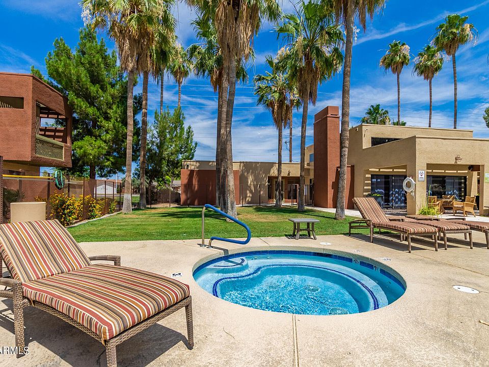 Stylish 1 bedroom 1 bath condo located in the heart of Old Town Scottsdale. You will love this ground floor unit with a huge patio overlooking the green courtyard and water feature. Sunrise Condos offer heated pools, spas, large fitness center with yoga room, fire pits, theater, community grills and gorgeous landscape. Condo is conveniently located to everything Scottsdale has to offer. Walking distance to the Giants training stadium, shopping, restaurants, grocery and many local attractions! All furnishings currently in unit are available and negotiable on a separate bill of sale.