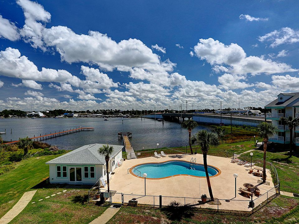 Prime waterfront location overlooking Grand Lagoon on the South side. One bedroom with loft on the third floor. Newly renovated with cool gray paint, cortex ultra luxery vinyl plank flooring, custom white shaker style cabinets with quartz countertop mosaic splashback tile, stainless steel appliances, hunter ceiling fans, new deep molar tub with subway wall tile, wall to wall mirrors in living area. Private balcony overlooking lagoon and pool. Low homeowner fees. Building has new siding, paint, windows, doors, roof and support piling on water side assessment from storm paid on unit. . . Located one half mile from public beach access. Close proximity to marina s,boat storage,slips,fishing and charter boats, golfing, fine dining, tourist attractions. Possible owner finance
