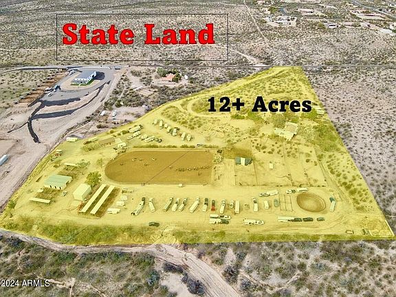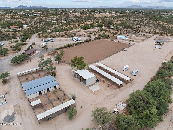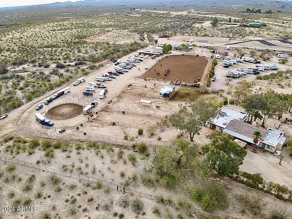 Hidden Hacienda, Wickenburg's Premier Team Roping and RV Camp Destination. Private, quiet, crisp and clean! 22+ Acres, contiguous to state land. Property available turnkey with tools equipment and furnishings. Secluded hilltop 3 bedroom, 3 bath home overlooking the property. 150 x 300 Roping Arena with Sprinkler System. 28 Covered Horse pens. 7 Stall Barn with turn outs and Tack Room. 60' Panel Round Pen. Outside pens approximately 180' x 40'. Covered Hay Storage and Connex Tool Shop. RV Camp and Club House is county approved and permitted in 2016 offering 110, 30 & 50 amp, plug-ins at each pedestal, water and septic. Club House offers an open-air lounge, two commercial washers and dryers, a commercial ice maker, two bathrooms, one with handicap accessible custom tile show Custom Cabinetry and furnishings. Home has an expansive and very private back yard, new roof and fresh interior and exterior paint as well as new tile and carpet. Property available turnkey with tools equipment and furnishings. Acreage available near the home to build additional shop or barn as well. Property Owned and offered for Sale by Arizona Licensed Real Estate Broker.