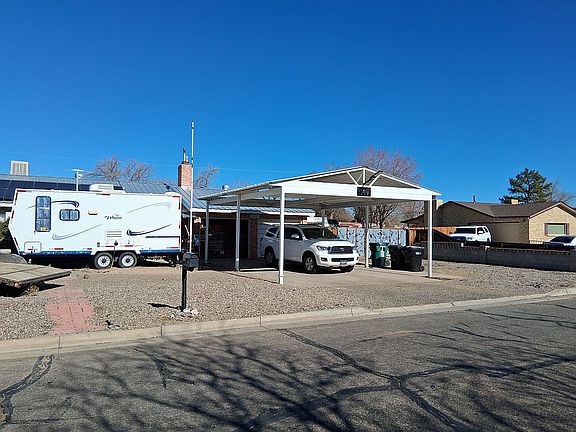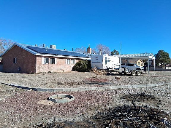 "See what I love description, for the complete description" Full solar system installed; monthly PNM bill is $5-18. Hybrid inverter, {allows a generator or battery backup system to connect} best quality panels. Electrical upgraded to 200 amp. 4 years old. 2 street access to the back yard. 24’x36’ shop, double garage doors. 220 volt, and 50 amp hook up for an RV. Not heated. It has A/C and swamp cooler. Large air compressor and shelving remain. 864 sq. ft. Attached 2 car garage, 20’ x 25’, 500 sq. ft. Not heated, easy to tie into homes heating. One garage space, the rest in shelves storage. Exterior door into back yard. Pantry air lock connects to dining room. Off the dining room and attached 3 season room, not heated, easy tie into homes heating. 200 sq. ft. Small covered porch and door to back yard. Metal roof on house 5 years old, Galvalume, silver color. Metal roof on shop, same, 10 years old, Carport all metal construction. 22’ x25’, 550 sq. ft of shade for your cars. Electrical hook up, (dead headed) to the house. Not attached to house. 3 years old. Eyebrow covered front porch. All metal construction. 8’ x 21’, 168 sq. ft. of shade to sit under. Cantilever design, only 3 post hold it up. Not attached to house. 3 years old.