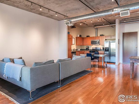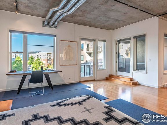 Sophisticated loft style unit at the Peloton. Quiet 3rd floor location looking down into the interior courtyard and facing directly west with views of the Arapahoe glacier & snow covered Indian Peaks. Spacious and open floor plan plus private covered patio with gas line for BBQ. Easy one level living with elevator access to covered parking and a storage unit. The Peloton allows rentals for a minimum of 30 days and this unit would make a perfect part time residence and medium term rental with Boulder's best amenities - roof top pool, hot tubs, firepit, fitness center, rec room, movie theater, dog park and outstanding onsite restaurants including Basta, Naked Lunch and Dry Storage. HOA fee includes water/sewer and gas (hot water, heat and gas oven/range). Easily add a wall or bookshelves to separate the bedroom area or enjoy the wide open free flowing floor plan just the way it is. Come see the possibilities today!
