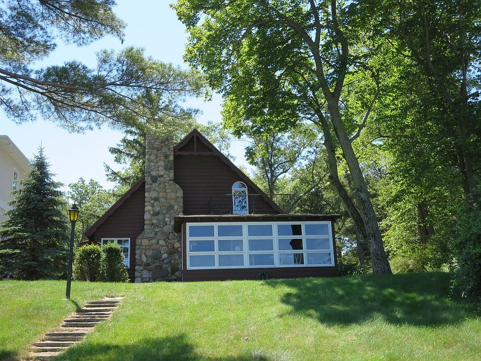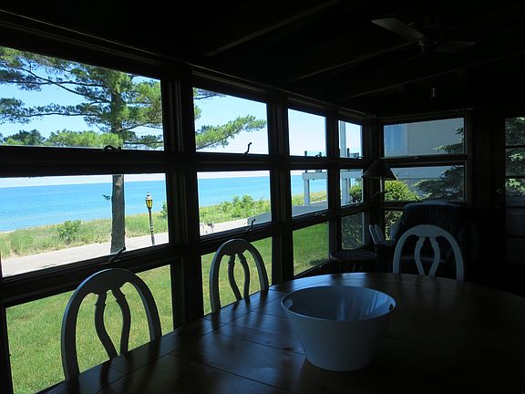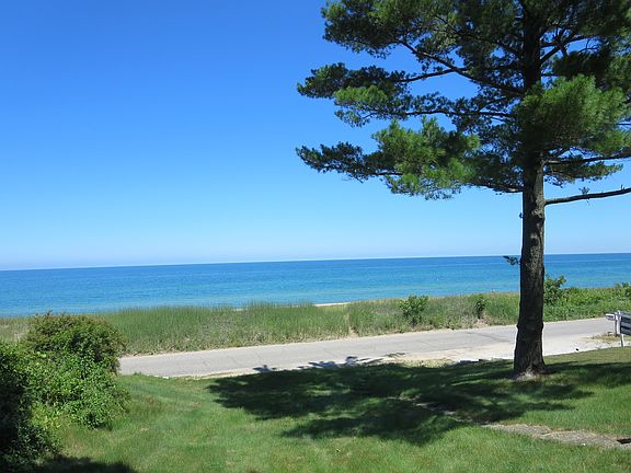 Imagine - Your own cottage with forever views of Lake Michigan on the hillside of Lake Shore Drive plus your very own private beach across the street. Such a rare offer seldom comes along! Floor to ceiling fieldstone fireplace in living room recent re-built and converted to gas. Garage is extra high to accommodate boat storage. New bath in loft which sleeps as many as you please. This home has all the charm in the world & is ready for a new family to make memories.