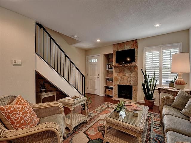 Stunning townhome in 78704! Completely remodeled several years ago with a rare 2 car carport, private mailbox and private backyard with limestone patio! Hardwood flooring, granite countertops, stainless appliances and plantation shutters are just a few of the upgrades. HVAC replaced in 2013, wood burning fireplace, travertine tile and jetted tub in bathroom. MOVE IN READY with washer/dryer and fridge. Enjoy the tree shaded pool and access to shops and restaurants on SOLA!