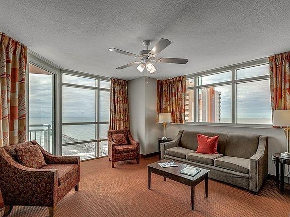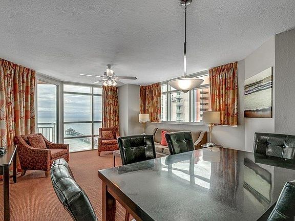 This corner 2 bedroom condo at Prince Resort Phase II offers all the unobstructed ocean view of a direct oceanfront condo without the oceanfront price. Incredible oceanfront and coastline views from every room. The living room and master bedroom both face the ocean and both open onto an over-sized balcony. The ocean views from the living room are enhanced by a picture window running the entire length of the room, providing a breathtaking coastline panorama! There is even a floor to ceiling window in the second bedroom providing yet another ocean view. Interior features include flat screen TVs in the living room and both bedrooms, ceramic tiled floors in the kitchen and baths, and designer furnishings throughout. A full kitchen and a washer/dryer combo add convenience. New HVAC in 2018. Great second home or vacation rental property. Prince Resort II has a rooftop pool deck on the 9th floor which offers a pool, lazy river and 2 hot tubs as well as a fitness club. Resort features in Prince I (which can also be used by the owner of this condo) include an oceanfront pool and kiddie pool, 2 hot tubs, an on-site oceanfront restaurant and an elegant check-in lobby. Owners and guests for both phases can use any amenities in either building. Parking is especially convenient for unit 1432 since it sits atop the 8 level parking garage. Prince Resort is located in the popular Cherry Grove section of North Myrtle Beach and is one of the newest oceanfront developments in this area. It overlooks the historic 985 FT Cherry Grove Pier. Prince Resort provides it's owners and guests a quiet, relaxing atmosphere but is still close to all of the many attractions of the Grand Strand. The HOA fee includes water/sewer, unit electric, cable, internet and telephone, as well as building insurance and HO6 contents insurance. All information is deemed correct, but it is the responsibility of the buyers and their agent to verify all information.
